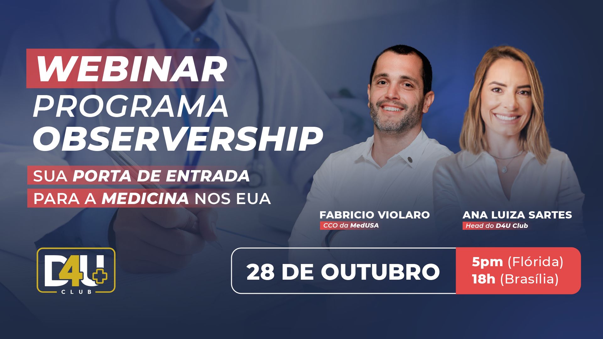 Em um webinar exclusivo, Ana Luiza Sartes (Head do D4U Club) recebe Fabricio Violaro (CCO da MedUSA, referência em carreira médica nos EUA) para desvendar o Programa Observership: a experiência prática que pode ser o grande diferencial na sua jornada para a residência médica americana.